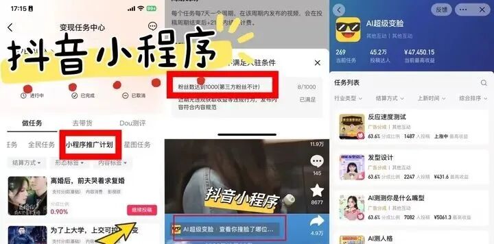 有没有看到过很多短视频里面主角说到一半的时候蹦出来一个广告,说哪里哪里卖手机比较划算,哪里哪里买手机比较靠谱,其实就是做推广任务。抖音上面有很多可以让你做的任务,完成了当然有分成和费用。这就是很多能拍视频,又有一定流量的人他们最直接的赚钱方式。因为不是所有人都有榜一大哥的加持,没有这方面资源的朋友就只能靠这个来赚钱。