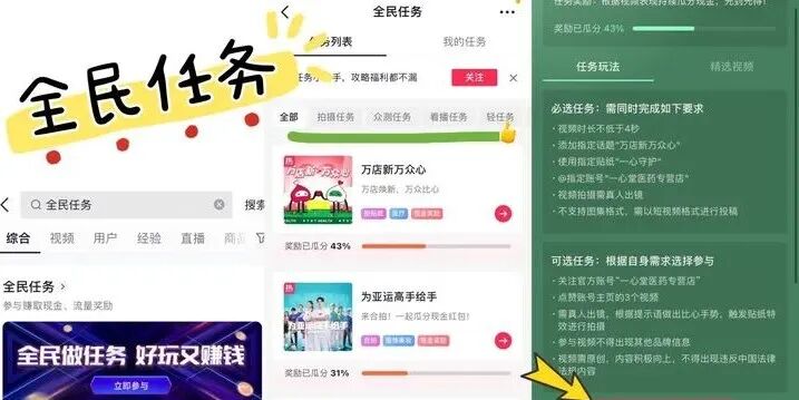 在抖音搜索“全民任务”,或者在创作者中心里面找到全民任务即可进入,按照任务的要求,艾特相关账号,带上相关话题,不用直播不用卖货,看播放量多少你就有多少收益;