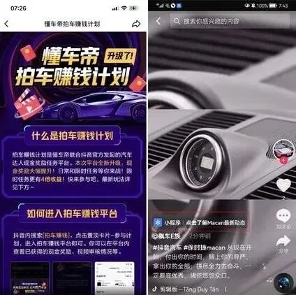 拍车赚钱计划是懂车帝联合抖音官方发起的汽车达人现金奖励任务平台,拍相关车的视频可以获得收益。