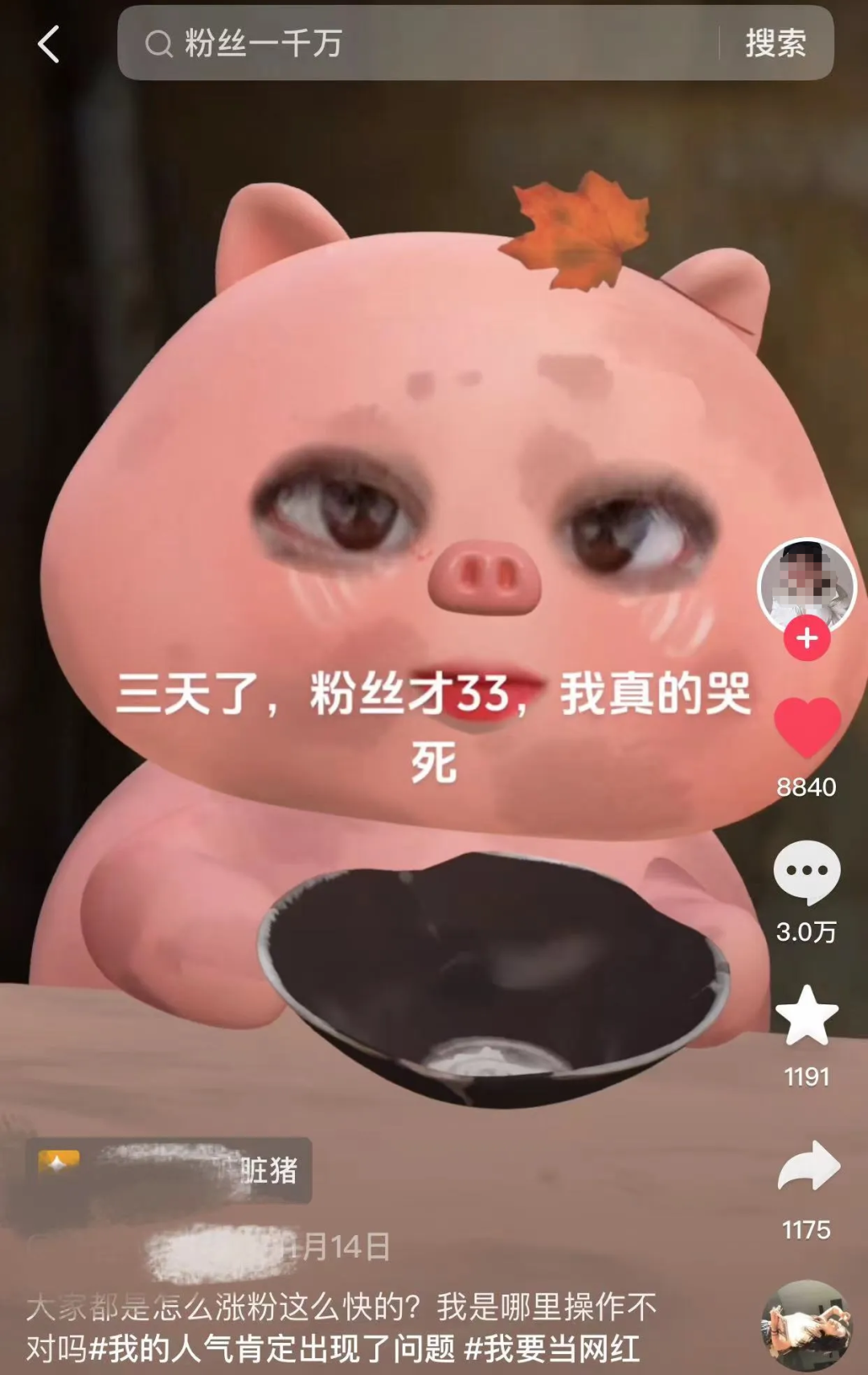 拍这个猪头特效的博主,大部分内容都是围绕「涨粉」,所以大家只要看到这只猪,就知道有个小白想要开始做自媒体,就想为他打打气。