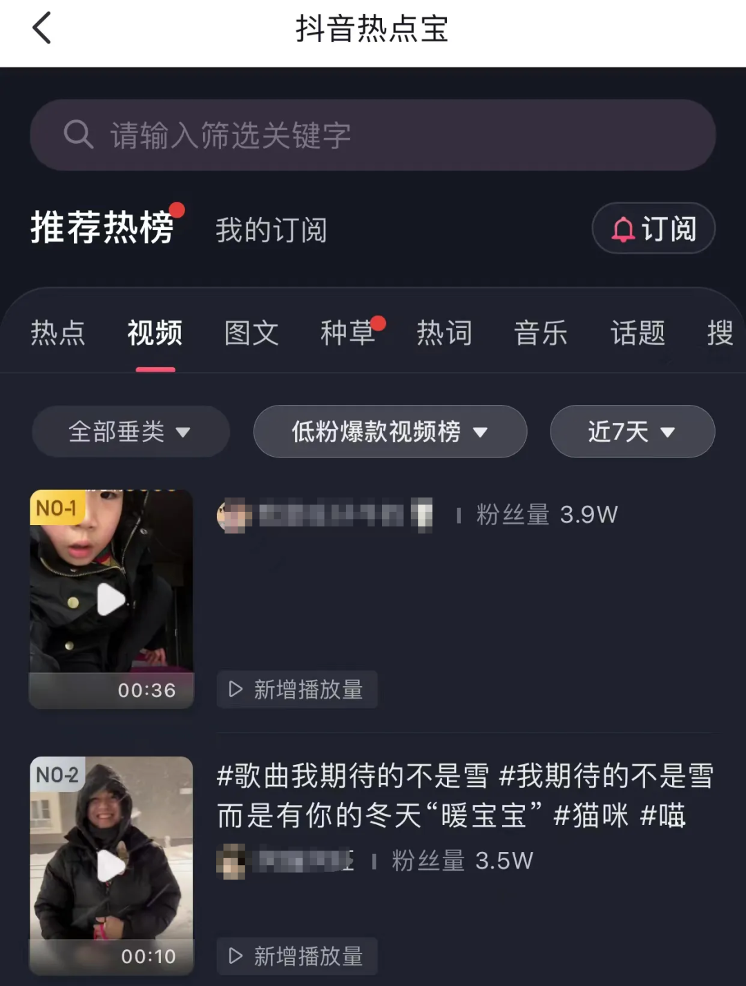 选择自己的领域-低粉爆款视频-近7天。