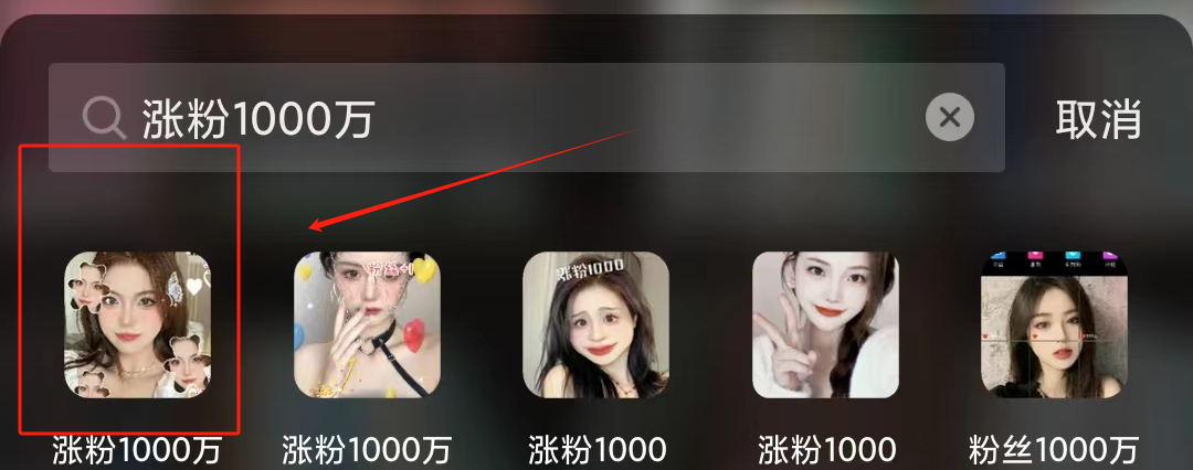然后点左边放大镜,搜索“涨粉1000万”,然后选择它,按住红心拍摄一段视频。