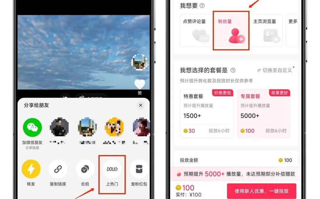 针对优质的短视频,我们可以通过投放DOU+的方式来进行增粉,针对“粉丝量”来进行投放金额和投放时间的设置。