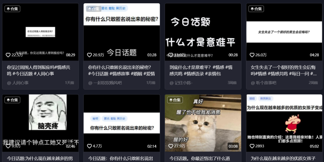 这也是这类账号能够获得大量流量的根本原因。这些经过验证的内容易于爆发,而且无需真人出镜,非常适合新手操作。