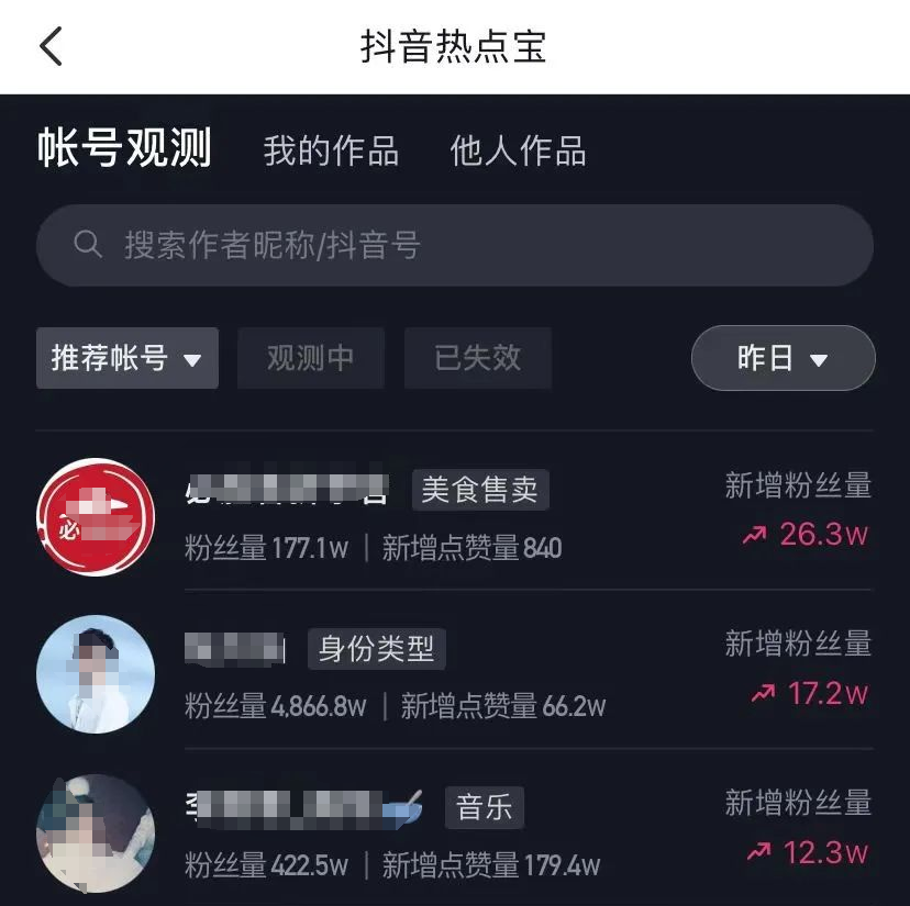 抖音搜索热点宝,点击【观测】,选择你的行业,找到最近7天涨粉最多的10个账号。
