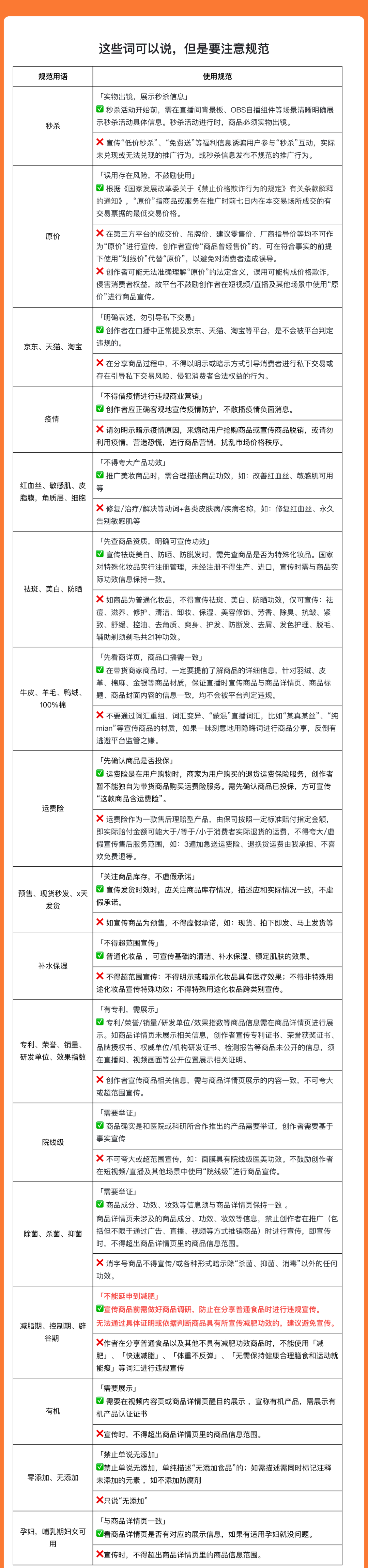 还有一类词汇,在口播的时候被提示违规,不是因为这些词不能说,而是说的时候要注意符合带货规范。比如秒杀产品,需要实物出镜,展示秒杀详细信息,不可诱导低价秒杀,免费送等福利诱骗信息。