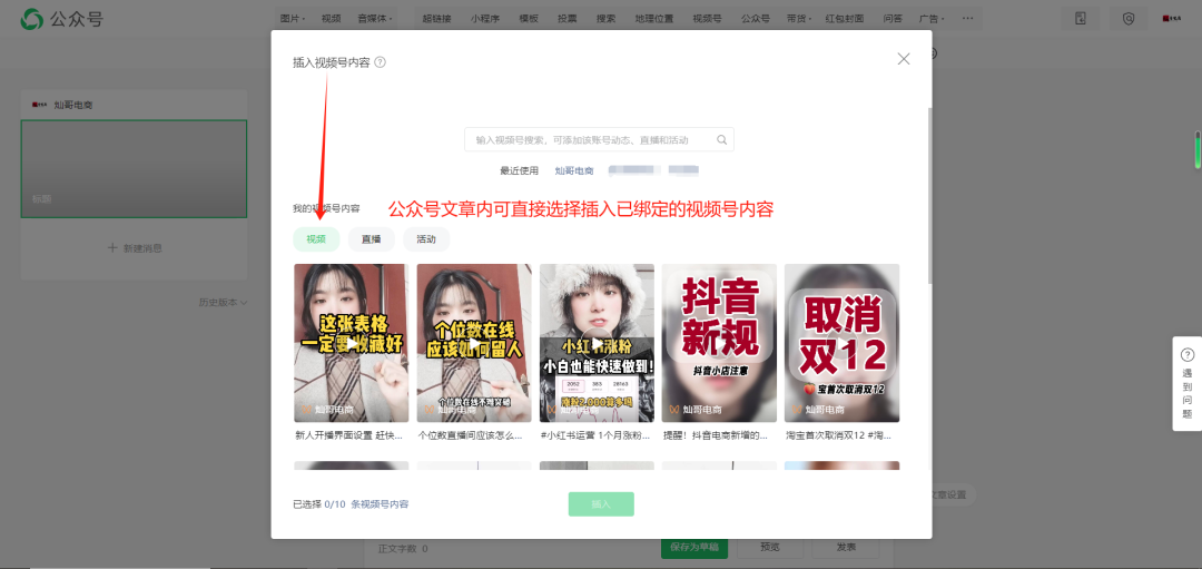公众号文章内可插入视频号视频内容或者直播预约卡片。
