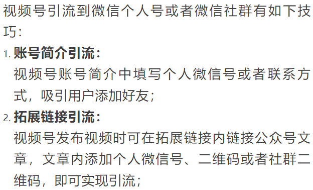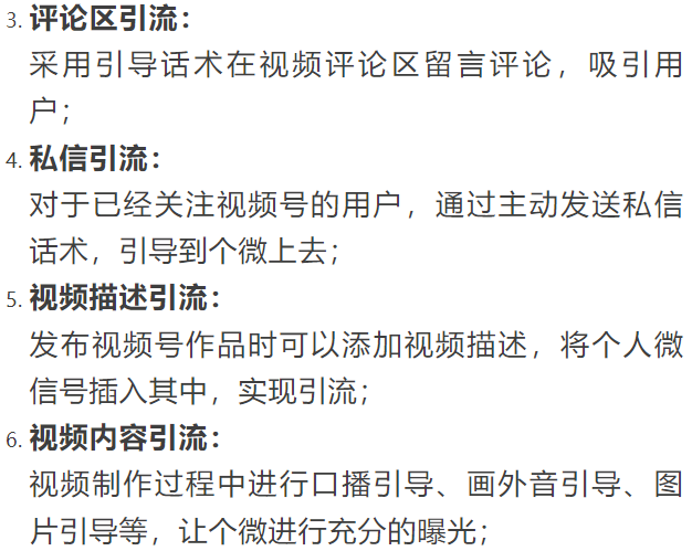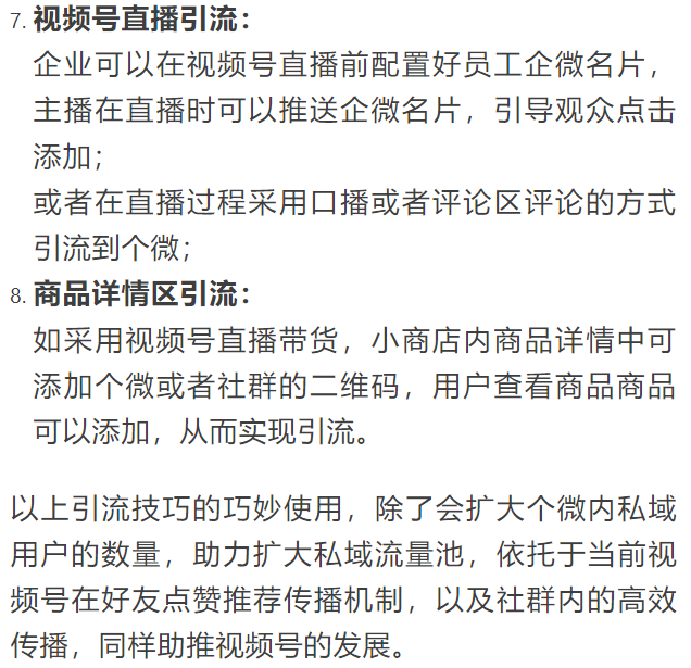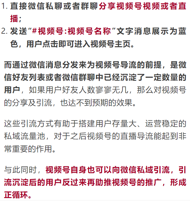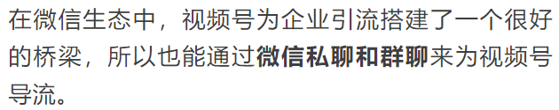 但是,由于公域为视频号导流增幅有限,所以大多数视频号的导流重心都放在了私域导流上。私域流量可以以较低的成本触达用户,随着视频号和私域的连接越来越多,视频号运营者们可通过多种方式实现对视频号的引流推广。
