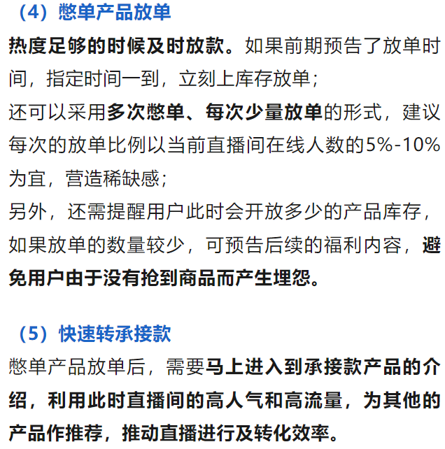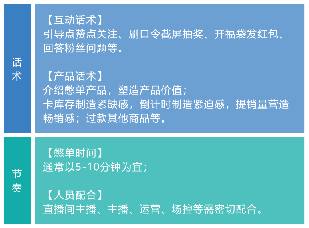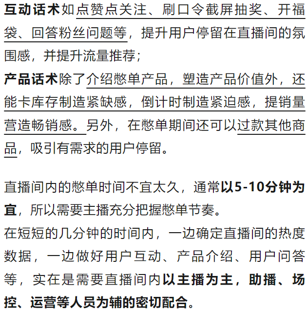 这类产品在憋单期间需要结合各种话术,如产品话术、互动话术、关注话术等,拉长过款时间,提高互动频率和停留时间,促进成交。