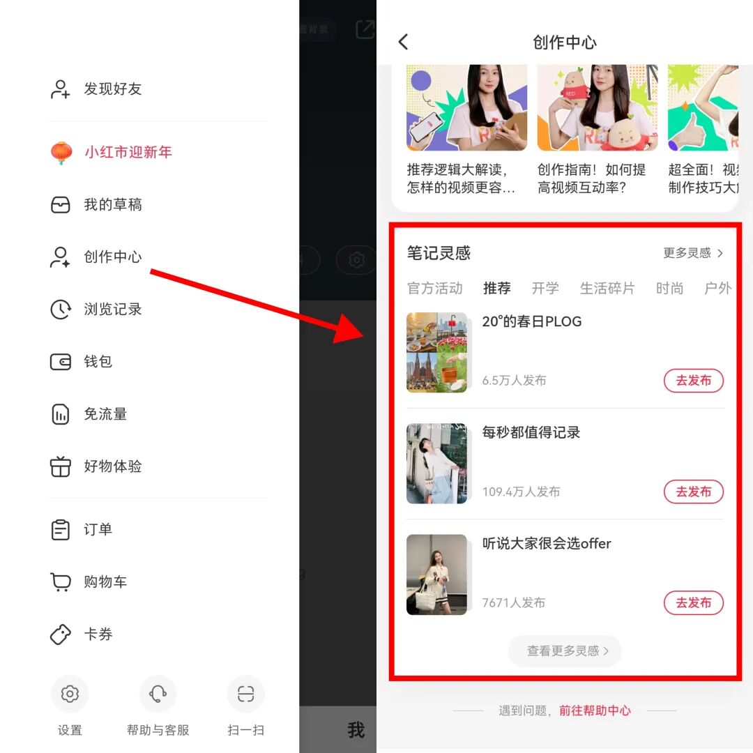 点击“我”页面左上角——“创作中心”——下拉找到“笔记灵感”。笔记灵感下设置有推荐、开学、生活碎片、时尚等多个板块内容,选择任一灵感发布笔记,不仅可能获得流量加持,还有机会登上优秀创作者荣誉榜单。