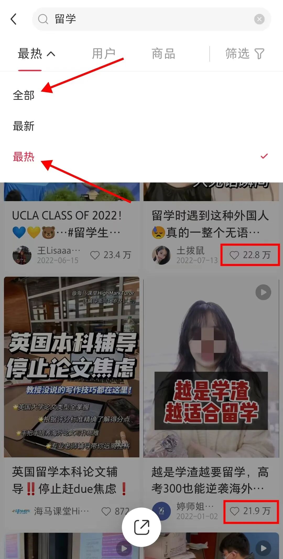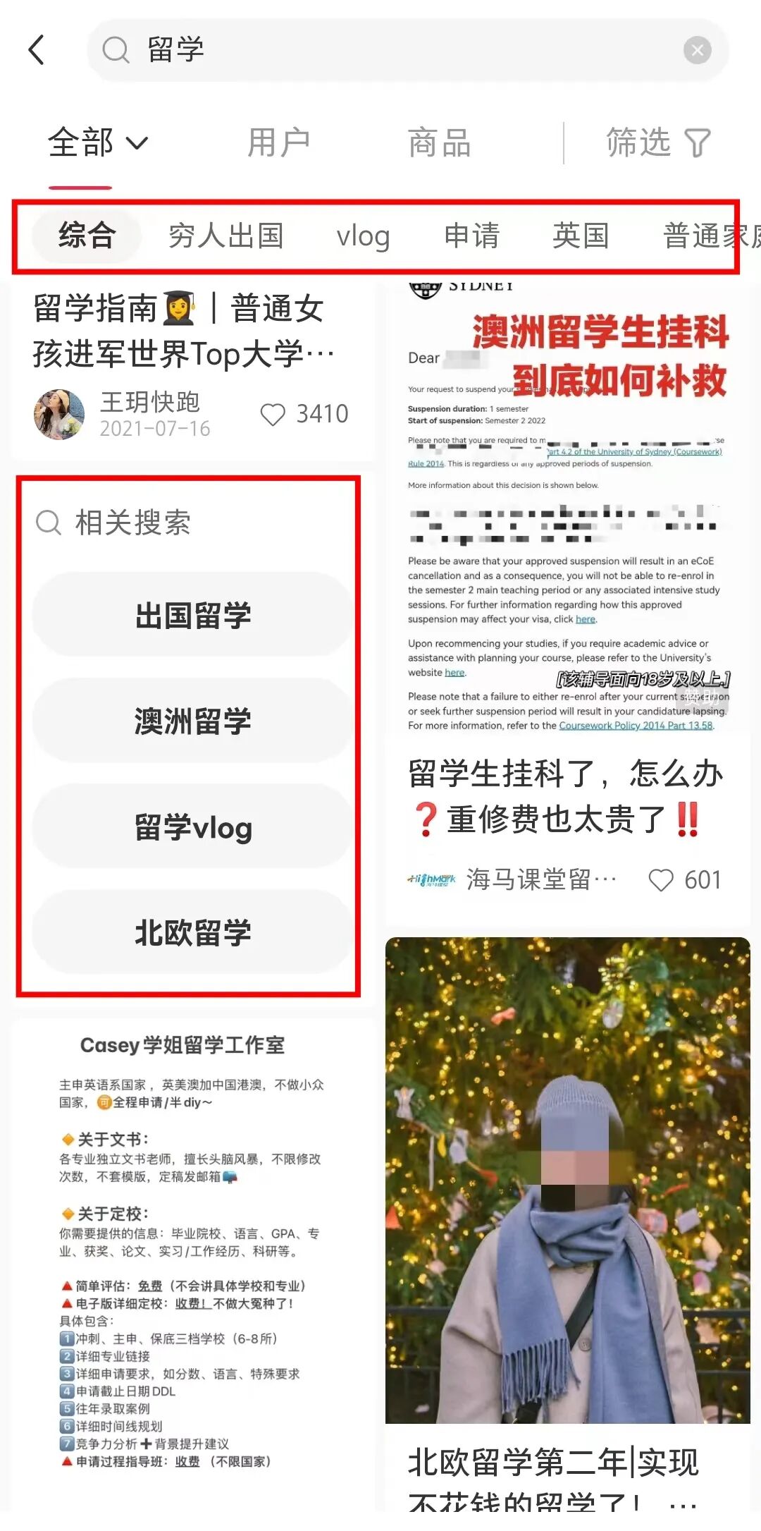 搜索某些关键词后,搜索页面会出现一行关键词标签,每个关键词标签下对应不同的笔记内容。下拉还会有相关搜索的关联词。这些都可以作为选题的切入点。