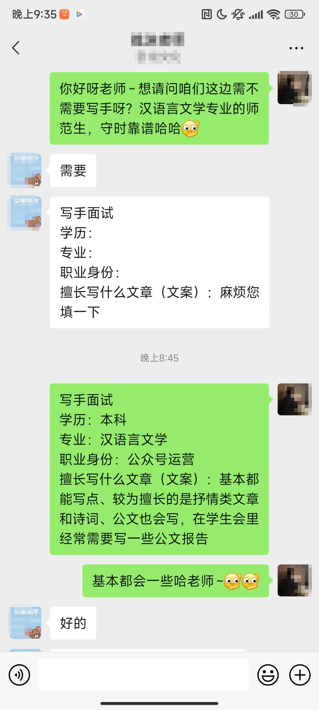 话术1:你好呀老师~想请问咱们这边需不需要写手呀?汉语言文学专业的师范生,守时靠谱哈哈