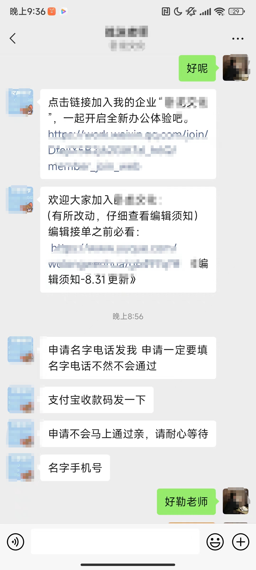 想当于是给他们刷个单,到了这一步就看店铺的习惯了,有的会是用企业微信群派单就需要申请他们的企业微信,按照要求申请就好,有的直接微信派单的就给你拉群进去了。