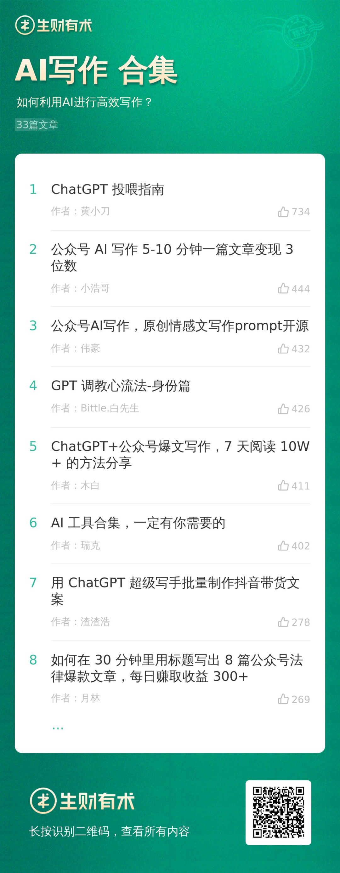 如果你看完本文后,想进一步深造AI写作,不妨看看我们从生财有术星球整理的【AI写作合集】。