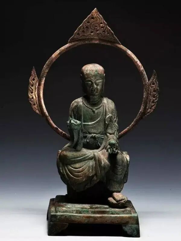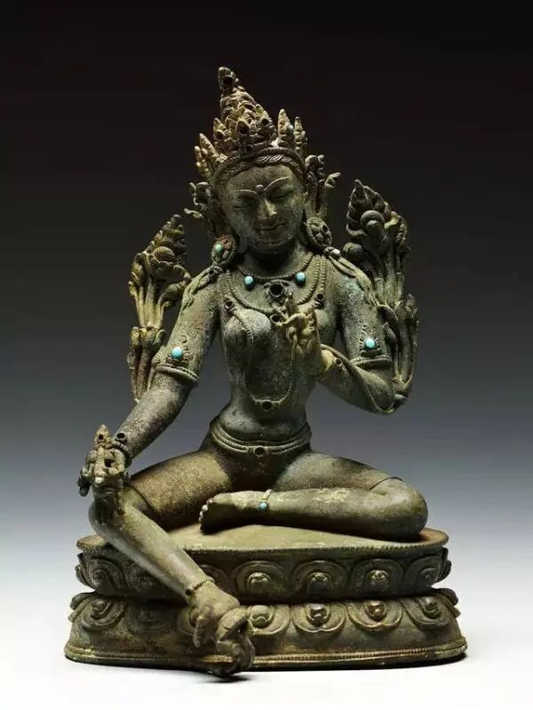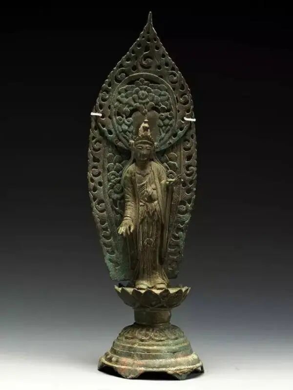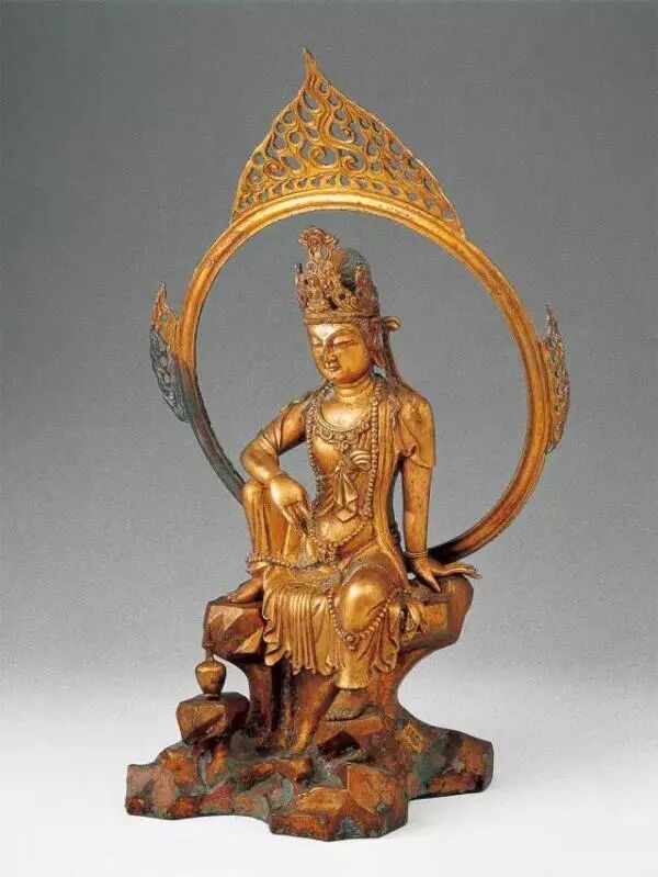 万佛塔地宫中发现的这尊“鎏金铜水月观音”, 高38.5厘米、底座宽20厘米,观音头顶花冠,冠前正中为化佛,头微低,右腿抬起,置石座之上,左腿自然垂落。右侧石座下置一净瓶。身后圆形背光,外缘上、左、右各饰火焰。