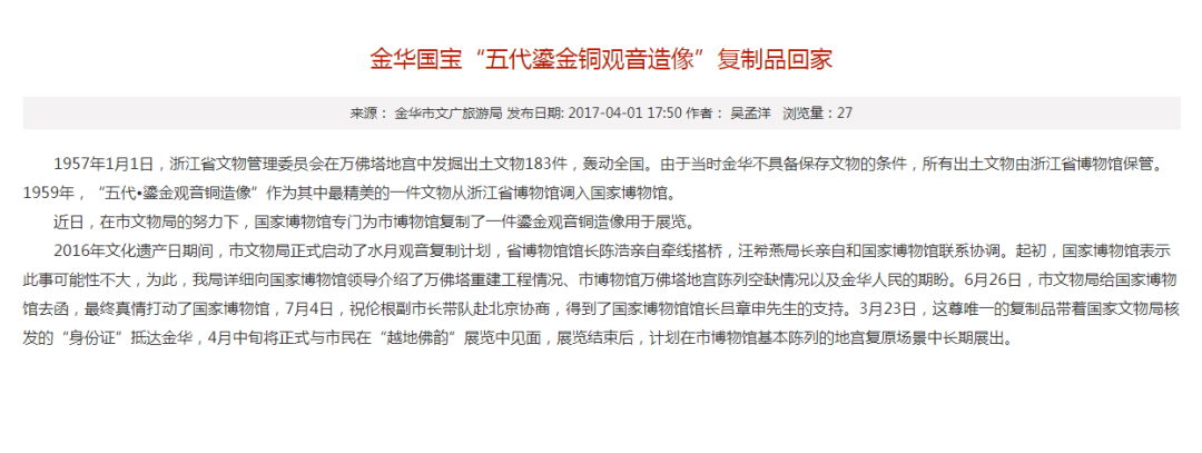 经过数月的深入沟通和不懈努力,国家文物局最终批准了国家博物馆为金华市博物馆复制一件珍贵的鎏金铜观音造像,以供公众展览。2017年3月23日,这尊被复制的“五代鎏金铜观音造像”在获得国家文物局颁发的“身份证”后,抵达金华,并在“越地佛韵”展览中亮相。