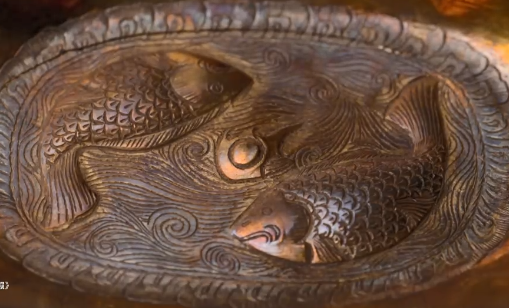 他的心中涌起了一股莫名的惊奇。白色土层下,一个被泥巴包裹的小金碗逐渐显现。阳光照耀其上,金光闪闪,碗底雕刻的两条金鱼仿佛在水中游动,栩栩如生,小巧玲珑,令人叹为观止。