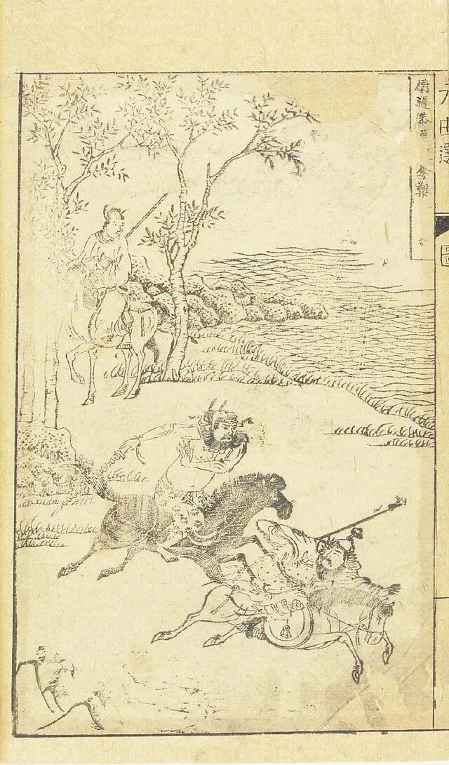 整个画面宏大而精致,共描绘了7位人物。画面上,旗帜飘扬,祥云缭绕,山石后一骑马而来的武将,头戴双翅朝天幞头,身着长袍系双玉带,帝玉装束,神态自若。紧随其后的是一位戴冠长须的武将,左手搅辔,右手执钢鞭,纵马疾驰。再往后是山石、旗帜和三位执矛披甲的士兵隐匿其间。画面的另一侧,两人正在激烈对战,一人头戴束发小冠,手执钢叉,回身招架;另一人手执长矛,紧追不舍。