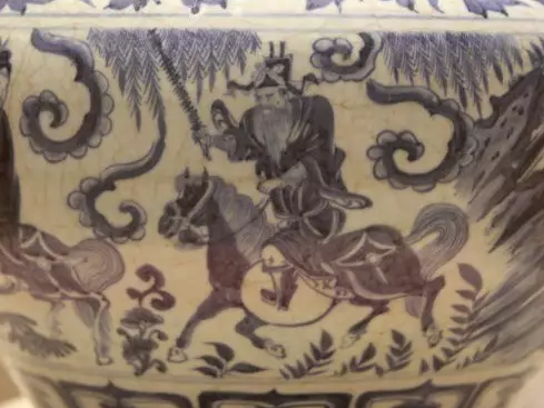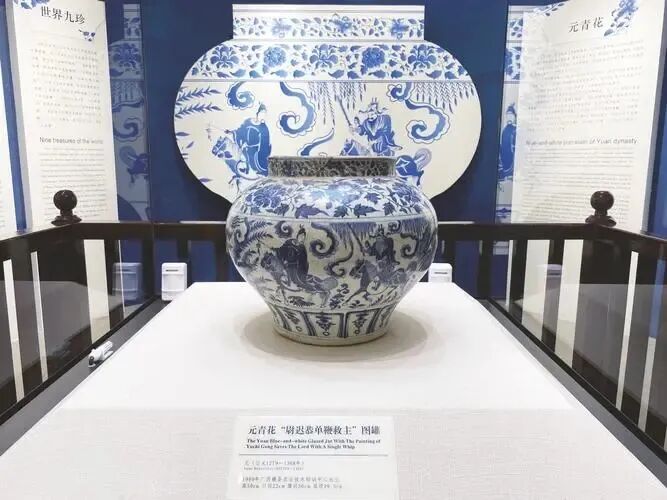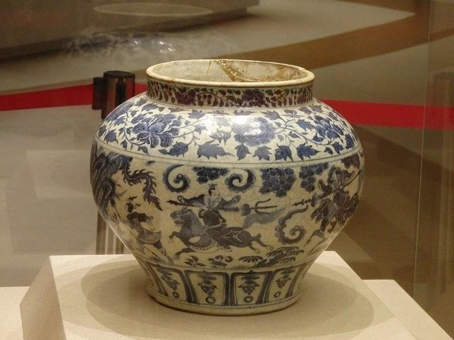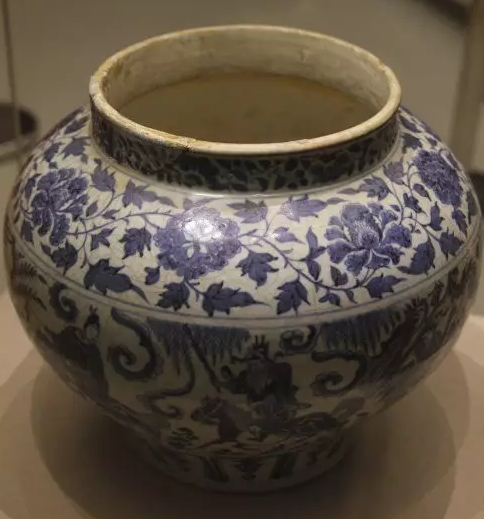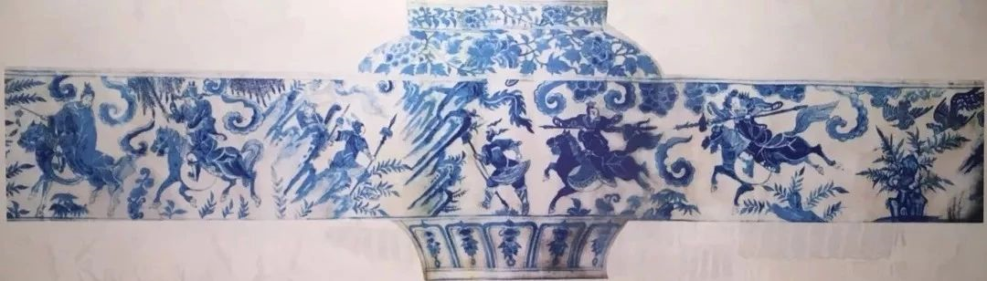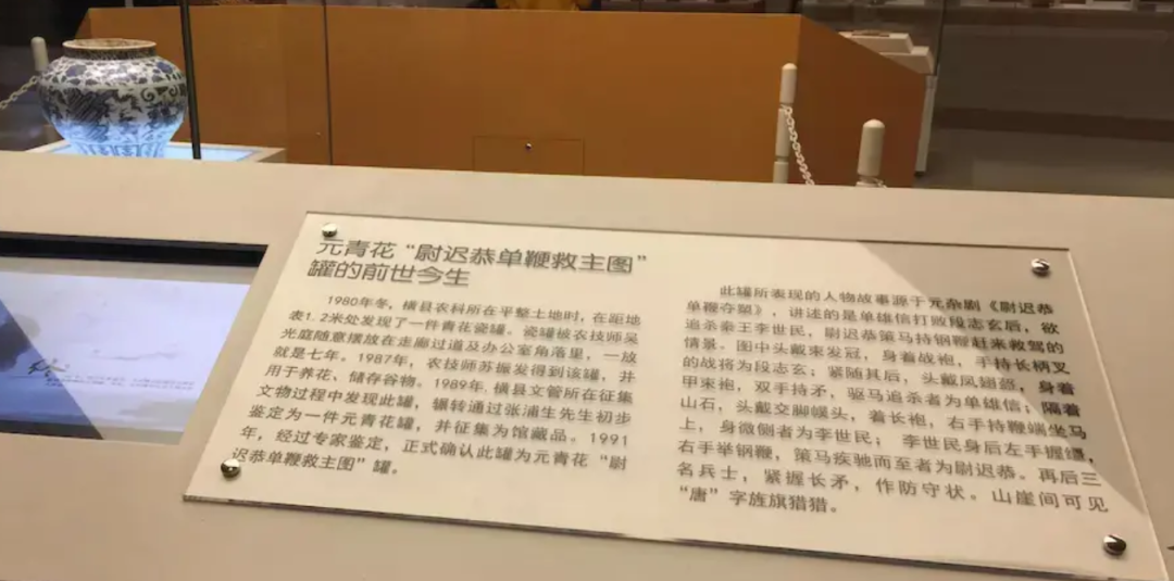 在广西南宁博物馆中,珍藏着一件名为“元青花尉迟恭单鞭救主人物罐”的瓷器。这件瓷器高30厘米,口径22厘米,腹径36厘米,底径19.5厘米,其图案布局独具匠心,从上至下依次为缠枝花卉、缠枝牡丹、主题纹饰以及变体莲瓣纹。主题纹饰以生动的青料绘制了经典的历史故事,即元杂剧《尉迟恭单鞭夺槊》中的情节。