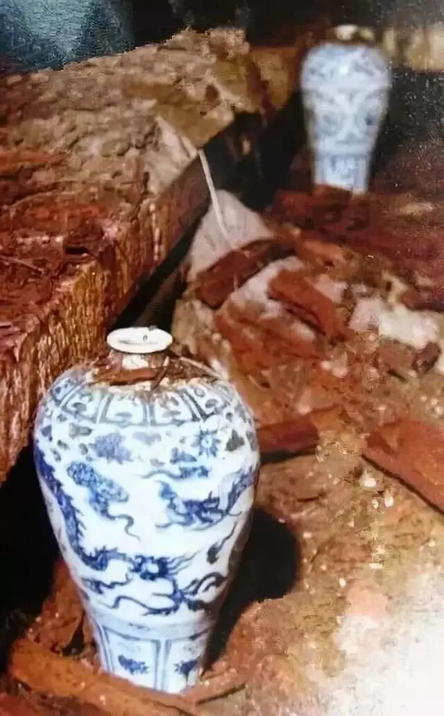 紧接着,考古专家们来到了后室之中。在这里安放着郢王夫妇的棺椁。当他们进入后室时,一个巨大的棺床出现在后室的正中间。然而令人遗憾的是,主棺已经垮塌无法分辨。在棺床前摆放着两个被称为“魂瓶”的瓷器,其中一件为四爱图梅瓶,另一件为龙纹瓶。在棺床的东西两侧还有两个壁龛,壁龛内也放置着大量的随葬品。眼前的景象让考古队兴奋不已。虽然他们未能找到郢靖王夫妇的遗骸,但大部分陪葬器物却得以保留下来。