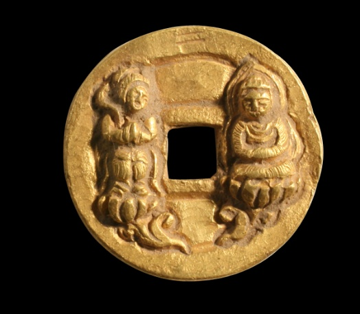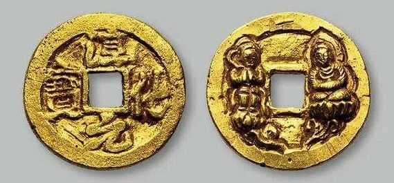 经过考古专家和古钱币专家的研究,确定这批金币为宋代淳化年间铸造的“淳化元宝”佛像金钱币。这些金币直径24mm,厚度1.2mm,穿孔直径5mm,佛像浮雕高度2mm,每枚重12g,金的成色高达96%以上。