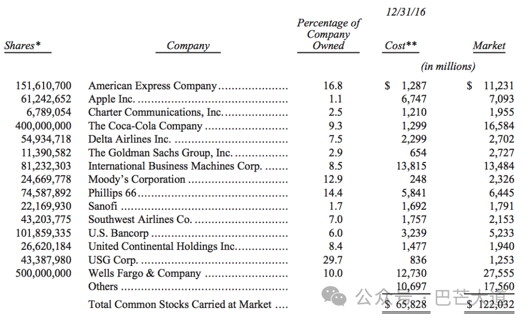 2. 这是伯克希尔·哈撒韦公司实际购买股票的成本价,也是公司计算资本所得税的根据。在一些情况下,符合一般通用会计标准的成本与实际成本不相同,这是因为根据一般通用会计标准的规定,公司对一些股票进行资产减值计提处理。