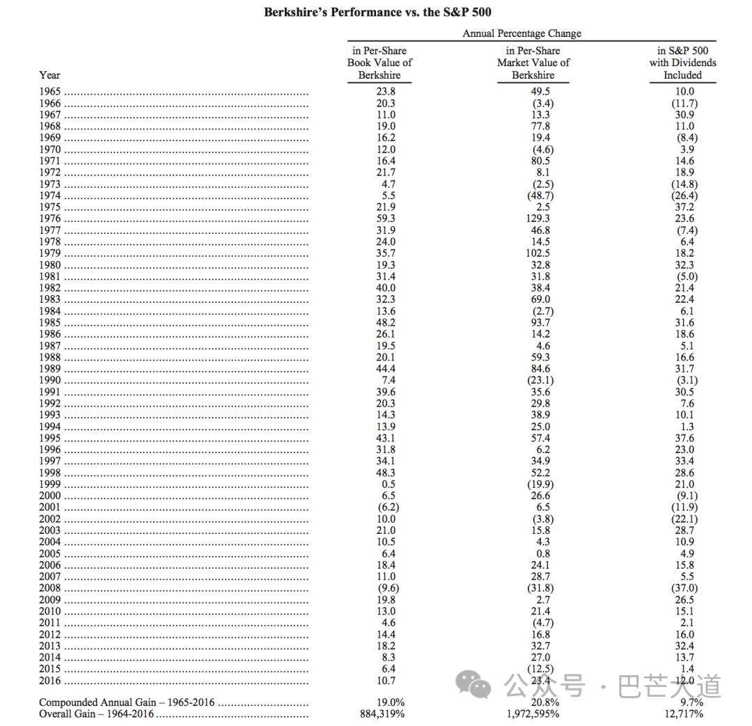 伯克希尔公司业绩同标普500指数历年以来的对比(第一列为伯克希尔每股账面价值年度增幅,第二列为伯克希尔每股市值年度增幅,第三列为标普500指数含股息在内的年度增幅)