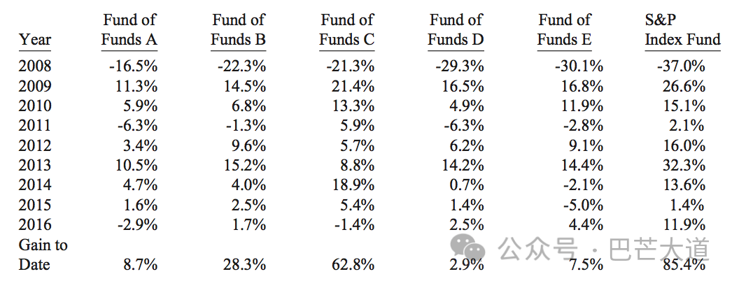 不过,我们还没有结束收费。记住,同样需要“喂饱”组合基金经理。这些经理会额外收取固定的手续费,通常为资产总额的1%。这样一来,尽管5只组合基金的整体表现不佳,但一些经理还是过了几年的好日子,并收取了“业绩”报酬。因此,我估计在过去9年里,5只组合基金获得的收益中有约60%都流向了两类基金经理的腰包!这就是他们为达成所谓业绩而给自己发放的无耻奖励。在几乎不用付出成本的情况下,数百位有限合伙人仅凭自己的力量都能轻易实现这些业绩。