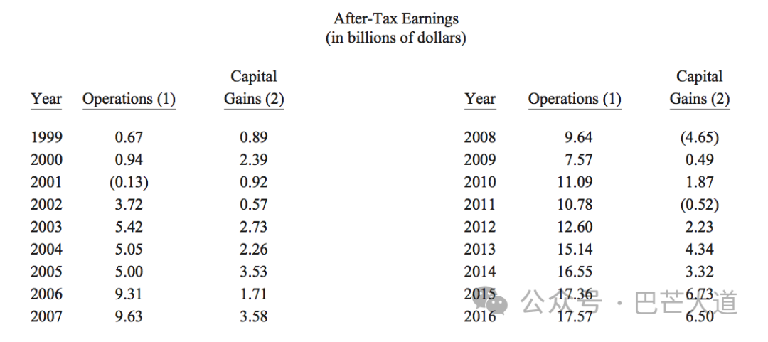 在我们结束投资这一章节之前,我想对股票分红和税费说几句话。伯克希尔·哈撒韦公司与大多数公司一样,一美元的股票分红比一美元的资本利得能够为公司创造更大的净利润。对于那些习惯性将资本利得看做提高税后收益唯一途径的股东来说,这可能有些意外。