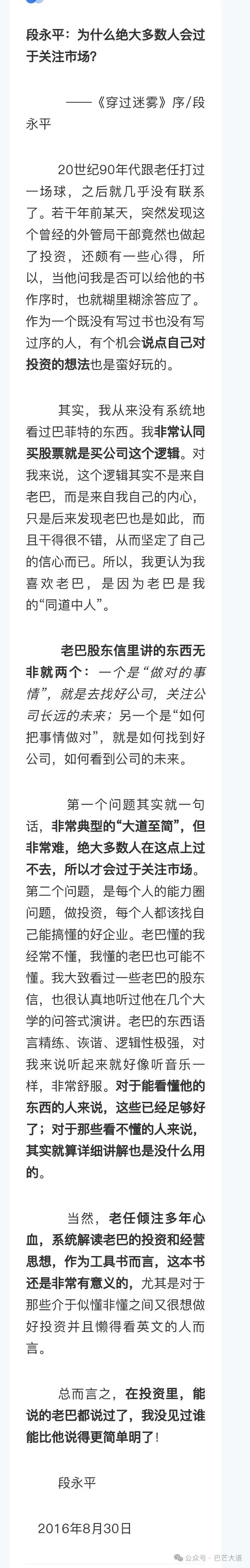 段永平:为什么绝大多数人会过于关注市场?