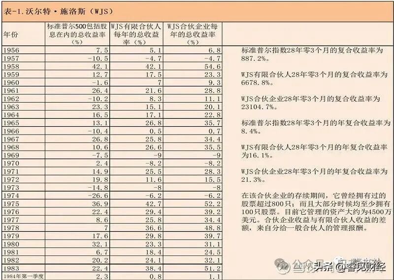 这是沃尔特·施洛斯(Walter Schloss)的投资记录。沃尔特没有上过大学,但他在纽约金融学院(the New York Institute of Finance)选修了格雷厄姆教授的夜间课程。沃尔特 1955 年离开了格雷厄姆-纽曼公司,在其后 28 年中,他取得了以下投资业绩记录。亚当史密斯(Adam Smith)经我介绍采访了沃尔特,他在他的著作《超级金钱》(Supermoney,1972)中对沃尔特是这样描述的:“他根本不与外界进行沟通,也没有任何获取有用信息的渠道。事实上,华尔街上根本没有人认识他,他也根本不理会华尔街上的任何想法。他只是仔细查看股票手册上的有关数据,向公司索取年报,他所做的一切仅此而已。”