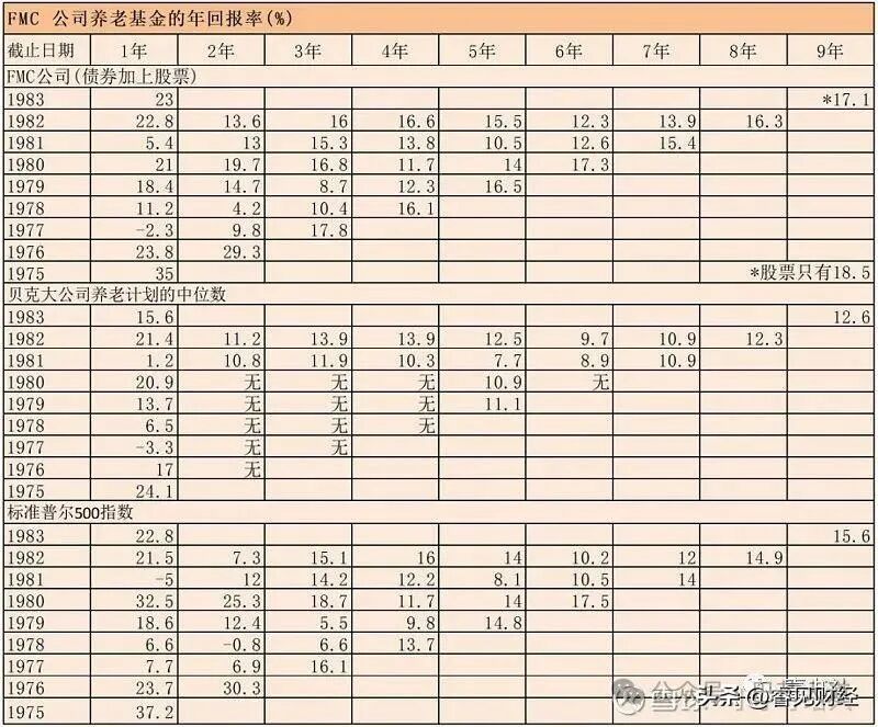 这份投资业绩属于 FMC 公司退休基金,我本人没有管理过这家基金的一分钱,但我的确在 1974 年影响了他们的决策,说服他们选择以价值为导向的基金经理。在此之前,他们采取与其他大型企业相同的方式来选择基金经理。在他们转向价值投资策略之后,其投资业绩目前在贝克退休基金调查报告(the Beckersurvey of pension funds)中超越其他同等规模基金而名列第一。