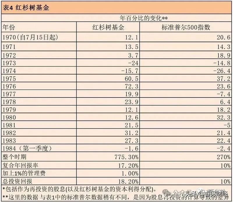 红杉基金(the Sequoia Fund)的投资业绩记录,该基金经理是比尔·鲁安(Bill Ruane),1951 年我们在格雷厄姆的课程中结识。他从哈佛商学院毕业后进入华尔街工作,他在工作中意识到自己需要接受一种真正的商业教育,于是报参加了格雷厄姆在哥伦比亚大学的投资课程,1951 年年初我们正是在那里相识。从 1951 年到 1970 年间,比尔所管理的资金规模相对于平均水平而言小得多,但投资业绩却远远超过平均水平。当我结束巴菲特合伙公司时,我问鲁安能否成立一家基金公司以吸收巴菲特合伙公司原来合伙人的资金,于是他就设立了红杉基金。他设立这只基金的时候恰恰在我结束合伙公司之时,这是一个非常糟糕的市场时机。他正好碰上了一个双重市场,并且遭遇了价值投资者相对业绩表现非常差劲的困难时期。我非常高兴地说,我原来的合伙人不但继续与他相守,而且追加了更多的资金,他取得如此优秀的投资业绩,当然让基金持有人非常满意。