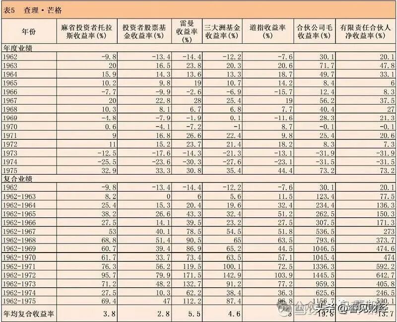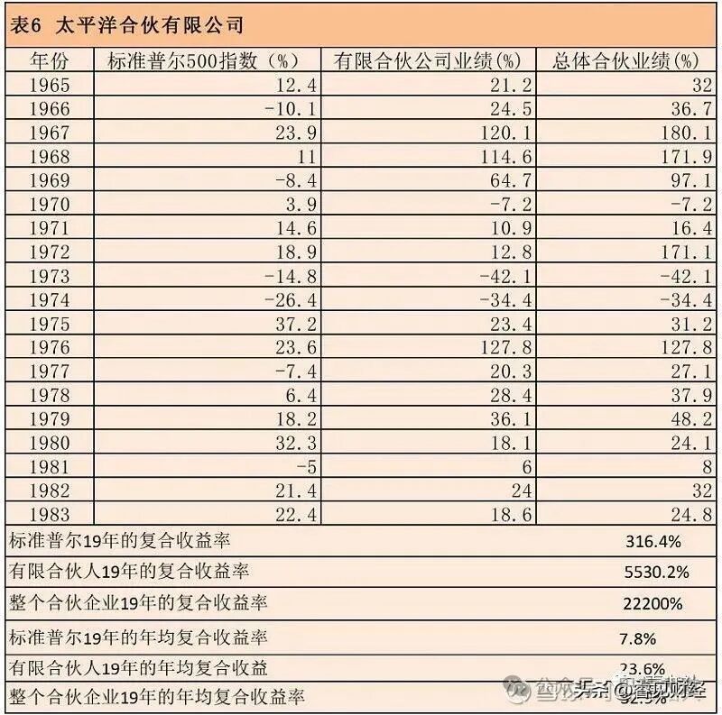 上表的投资业绩记录来自于我的一位朋友,他毕业于哈佛法学院,并且成立了一家律师事务所。我在 1960 年前后认识他,当时我对他说,律师作为一种业余爱好相当不错,但是他完全可以在投资中做得更好。于是,他成立了一家投资合伙人公司。他的投资风格与沃尔特·施洛斯完全相反,他的投资组合集中于非常少数的证券,因此投资业绩的波动性很大,但他遵循的同样是寻找价值被低估股票的投资策略。他愿意接受投资业绩从高峰到低谷的大幅震荡,正如结果所表明的那样,他正好是那种心理能力完全适合集中投资的人。不用多说,这正是我在伯克希尔公司的长期合作伙伴查理芒格的投资业绩记录。不过,当他管理他自己的合伙公司时,他的投资组合与我以及前面提到的投资人完全不同。