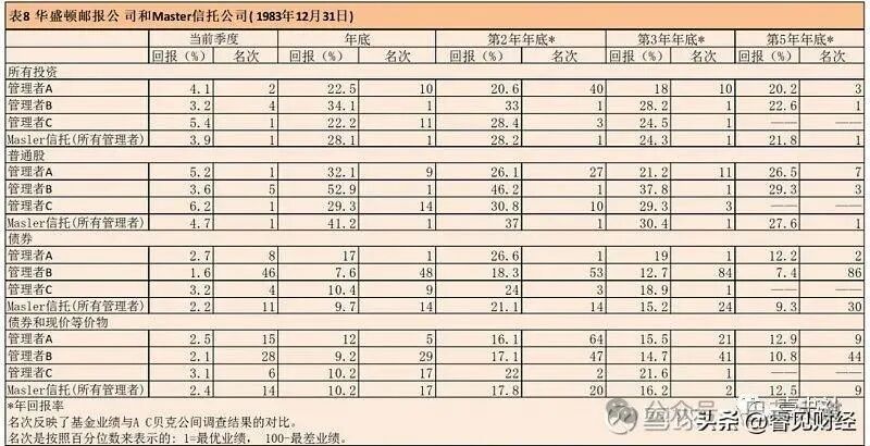 表 8 是华盛顿邮报公司退休基金(the Washington Post Company's Pension Fund)的投资业绩记录。几年之前,他们委托一家大型银行管理基金,后来我建议他们聘请以价值为导向的基金经理,这样能够使投资业绩更好。