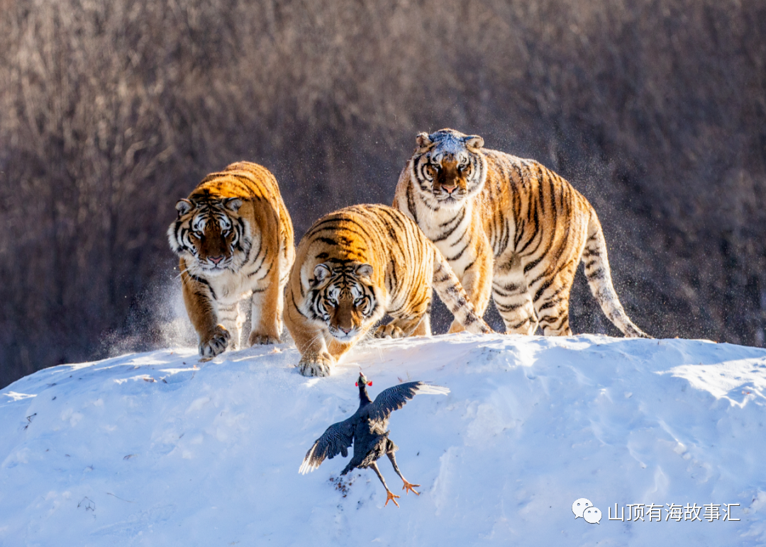 三只东北虎配合默契,时而左右夹击,时而快速穿梭。它们不仅要应对野牛的强大反击,还要争分夺秒地追击那头庞大的雄牛。而在这场角逐中,一切都显得如此残酷。