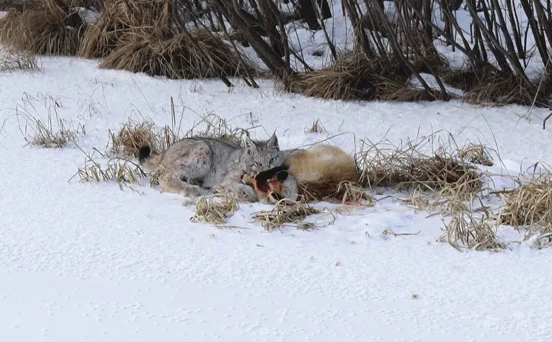 赤狐挣扎着试图逃脱,但猞猁毫不留情地将牙齿嵌入赤狐的颈部,发动致命一击。雪地上弥漫着血腥的气味,猞猁成功地击败了赤狐。