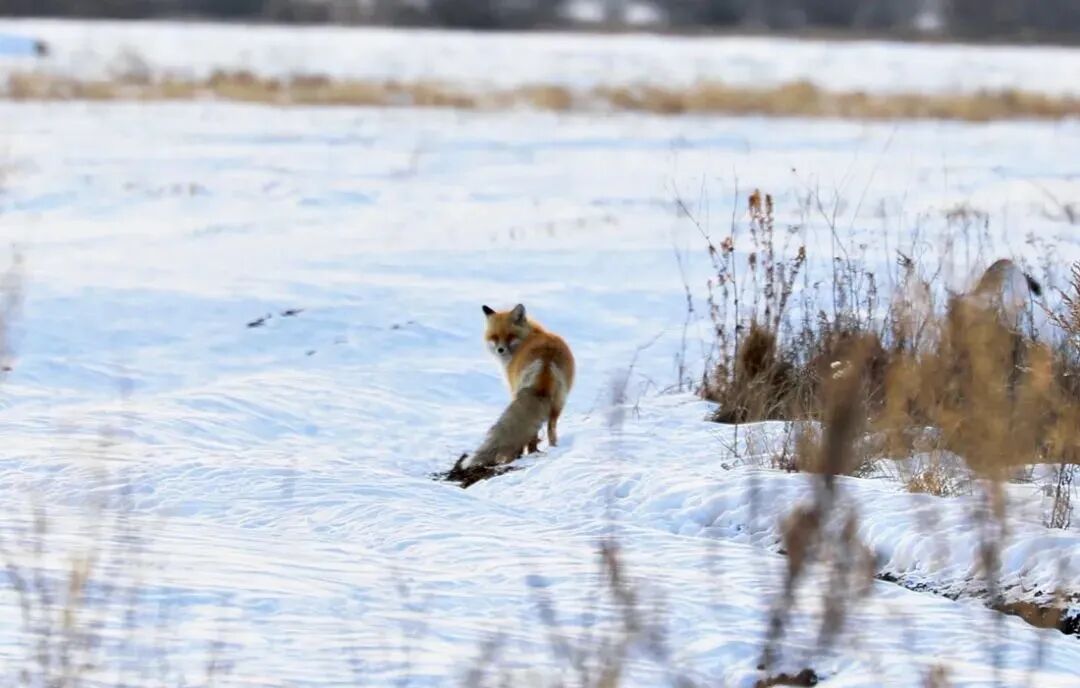 赤狐是这片雪原上的常见居民,毛色深红,身形矫健。在白茫茫的雪地中,它宛如一抹红色的流星,灵活地穿梭于雪野之中。