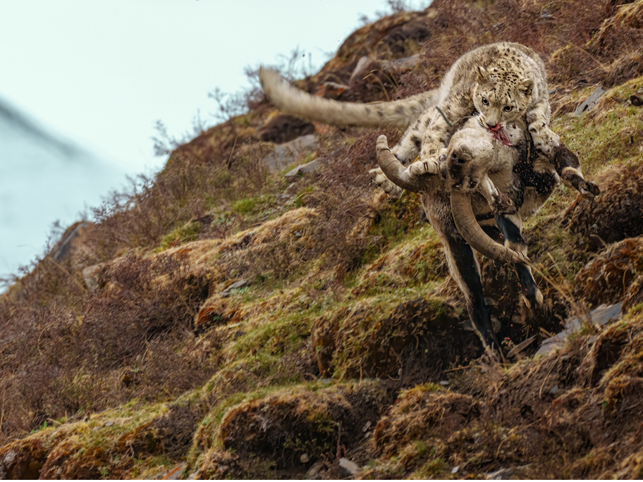 雪豹锋利的牙齿狠狠地咬住了山羊的脊柱,山羊瞬间瘫软在地。