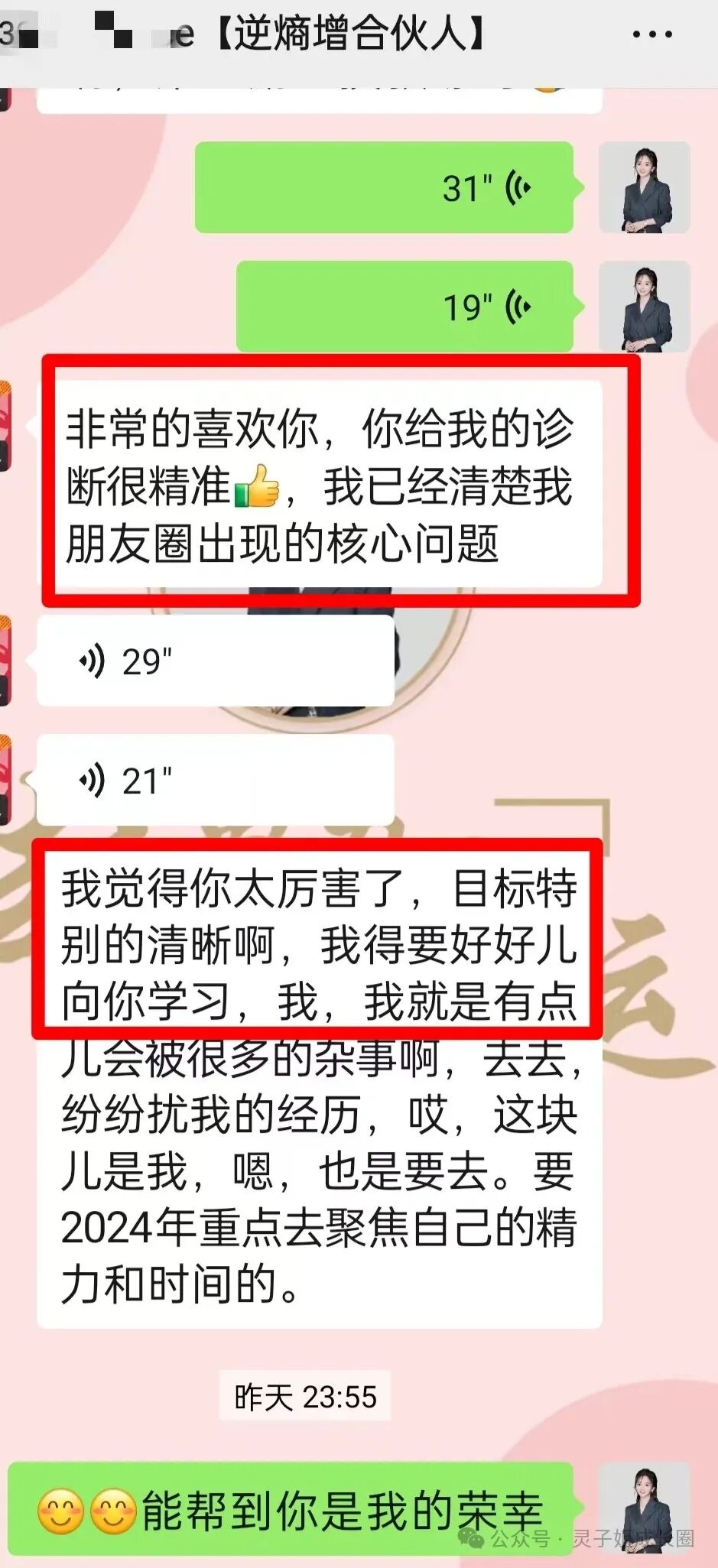 还有朋友圈诊断的伙伴,也是特别的满意,像她说的一下完全解决了她的卡点,瞬间醍醐灌顶😊