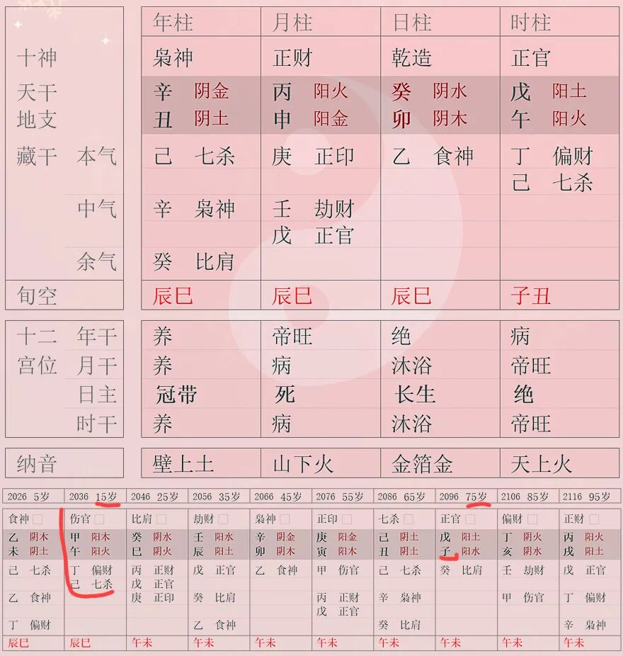 再者,最好不要有明显的地支相冲的大运,以及“伤官见官”、“倒食”的大运。为什么说不要有“明显的地支相冲的大运”呢?这是因为大运地支跟四柱地支之间的相冲是难以避免的,所以一般只考虑“阳刃冲”、“建禄冲”、“三合三会冲”、“伤官冲官”、“倒食冲”这几种情况即可。