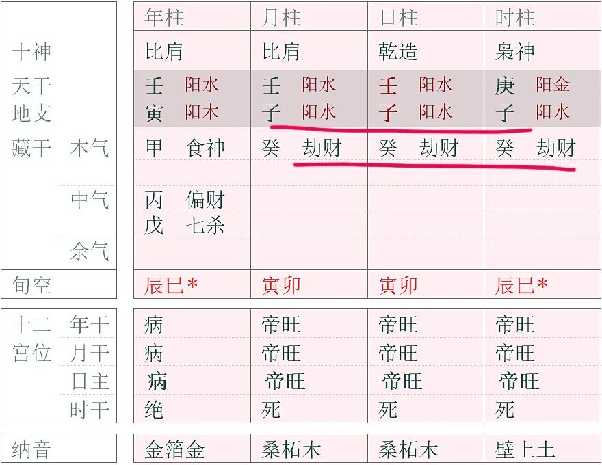 我以前曾经引用过一位网友的论述,用高压水管理论来解释了飞天禄马,今天我想用另外一种方式来解释下这类格局,那就是“兄弟齐心,其利断金”。为了能更清楚地说明这个论述,我虚拟了下面这个符合飞天禄马格条件的八字。