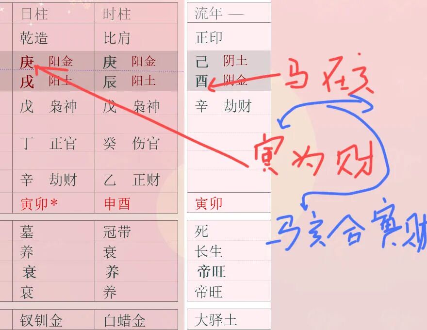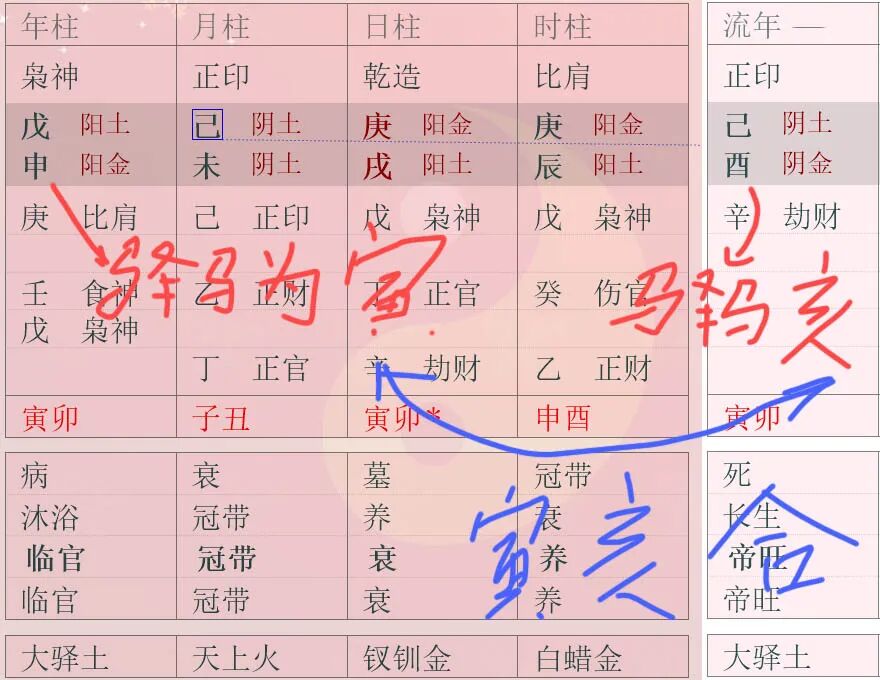 我们再来看看驿马和财星相合。下面这个八字中,流年地支的驿马为亥,它所合的正好是日干庚金的财星寅(当然,禄命法应该是以年干看财,此处以日干看财只是为了让大家看的更直接而已),所以为“马合财星”,禄命法认为这种流年命主容易发财。