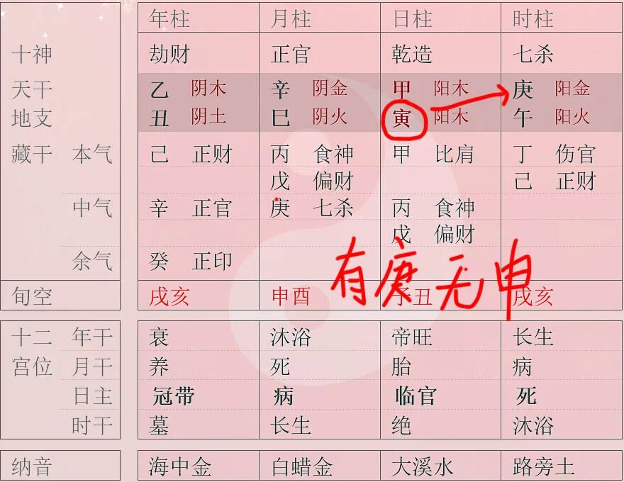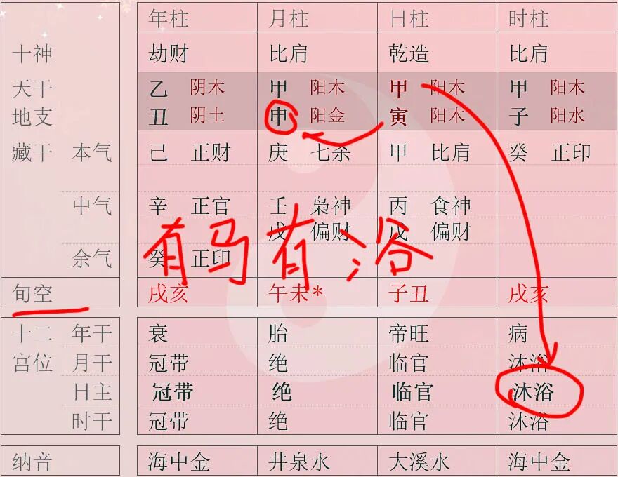 请注意这里是念“she”而不是“zhe”。折足的意思就是马腿折了,我们也可以理解为“马失前蹄”。马为什么“失前蹄”?路太滑的缘故。路为什么滑?水太多,在十二长生中跟水有直接关系的就是“沐浴”,所以《五行精纪》中才说:“胎月日时带驿马,而月日时中带沐浴者是也,遇此者永不得发也”。