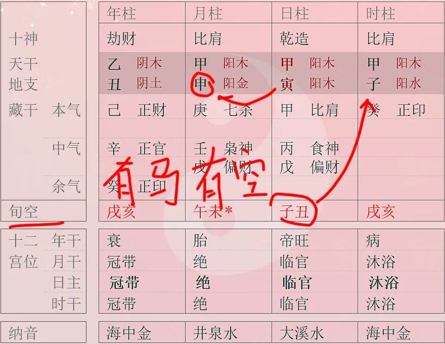 如上图所示,其实蹶蹄马就是四柱中有驿马也有空亡,当然《五行精纪》中指定是要空亡在日支,这是因为禄命法以年支看驿马,以年柱干支找空亡,所以在日支,子平法中日支不可能为空,所以子平法中其他柱为空我们也可以认为是蹶蹄马。