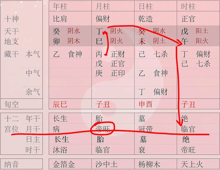 就这个八字来说,月令财星所以财星得令,月柱财星又是通根透干。月干的财星自坐帝旺,在时柱归禄(临官),所以财星处于极旺的状态。相对来说则命主偏弱,所以这个八字是典型的财旺身弱。假使没有天干的丁火财星,时支的午火财星也是得令所以身强,也是财旺身弱。