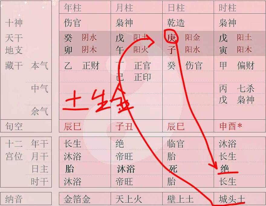 “死中得母绝逢生,富贵荣华别样新。廉简直温无燥暴,朱衣元是黑头人。此死绝为福格也,如金人见戊寅为绝处逢生,见庚子为死中得母,见庚午为败中有救,皆为福矣”。这段话是什么意思呢?如下图所示,日主为金之人,金到寅为绝地,但是戊寅纳音为土,土又生金。对于下图中的庚金来说,在戊寅就是“绝处逢生”。