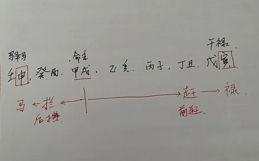 拦马也是如此,因为只能在前面拦,所以要用酉来拦住驿马申。为什么是癸酉?因为六十甲子中“癸酉、甲戌”是紧挨着的,且癸酉在甲戌之前。书中的赶禄拦马我们可以用下图来理解。
