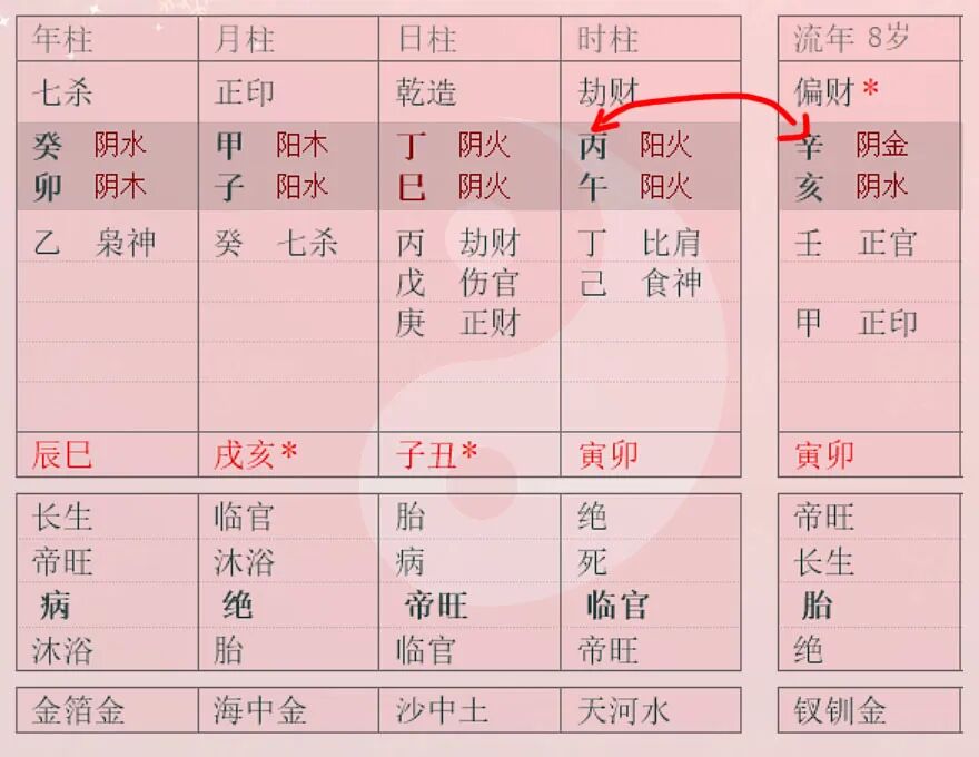 因此,劫财见到财星天然就是一种“相克”的状态,即使是我们上篇文章中提到的天干之间的“劫财与财星相合”(如下图所示),也是同时存在“相合”与“相克”的状态。其中相合是“干支”之间的相合,相克是“五行”之间的相克。