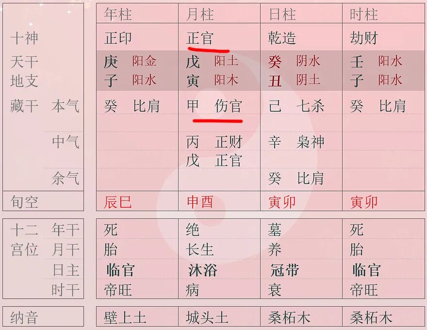 我们来看一个典型的例子。下面这个八字,正官透干,官印相生本来非常之好,但是月支的伤官为本气,直接克制了月干的正官。表面上看是官印相生,但其实是伤官见官,官星仍然可用但不稳定。对于这个正官星而言,月支的伤官就是“无情”的,而年干的正印就是有情的。